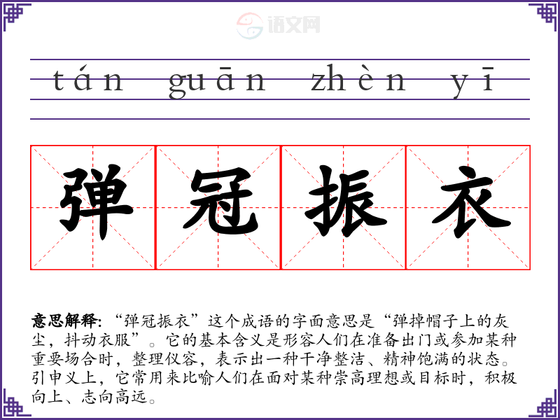 “弹冠振衣”这个成语的字面意思是“弹掉帽子上的灰尘,抖动衣服”。它的基本含义是形容人们在准备出门或参加某种重要场合时,整理仪容,表示出一种干净整洁、精神饱满的状态。引申义上,它常用来比喻人们在面对某种崇高理想或目标时,积极向上、志向高远。