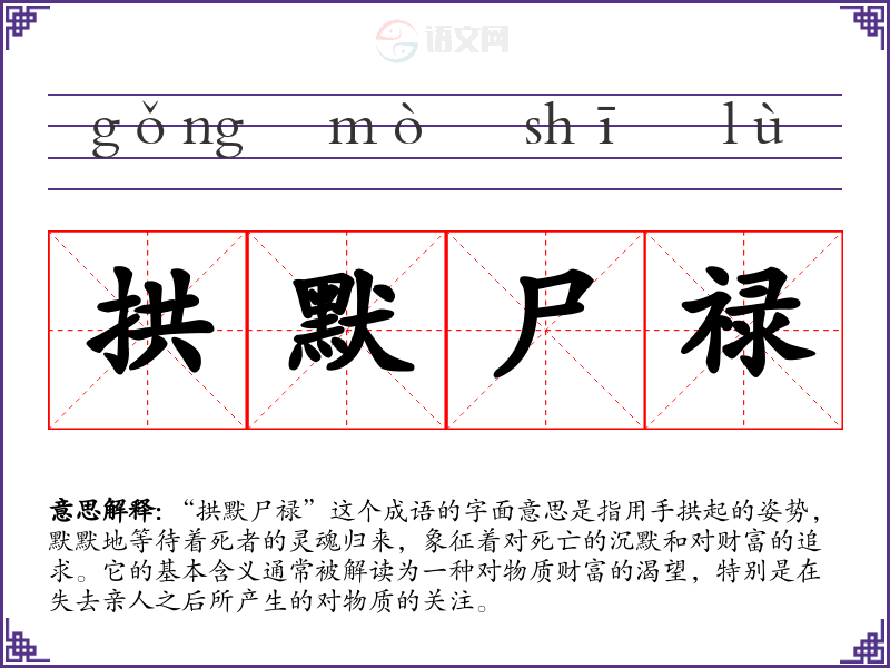 “拱默尸禄”这个成语的字面意思是指用手拱起的姿势,默默地等待着死者的灵魂归来,象征着对死亡的沉默和对财富的追求。它的基本含义通常被解读为一种对物质财富的渴望,特别是在失去亲人之后所产生的对物质的关注。
