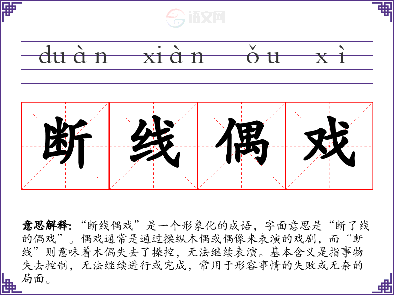 “断线偶戏”是一个形象化的成语,字面意思是“断了线的偶戏”。偶戏通常是通过操纵木偶或偶像来表演的戏剧,而“断线”则意味着木偶失去了操控,无法继续表演。基本含义是指事物失去控制,无法继续进行或完成,常用于形容事情的失败或无奈的局面。