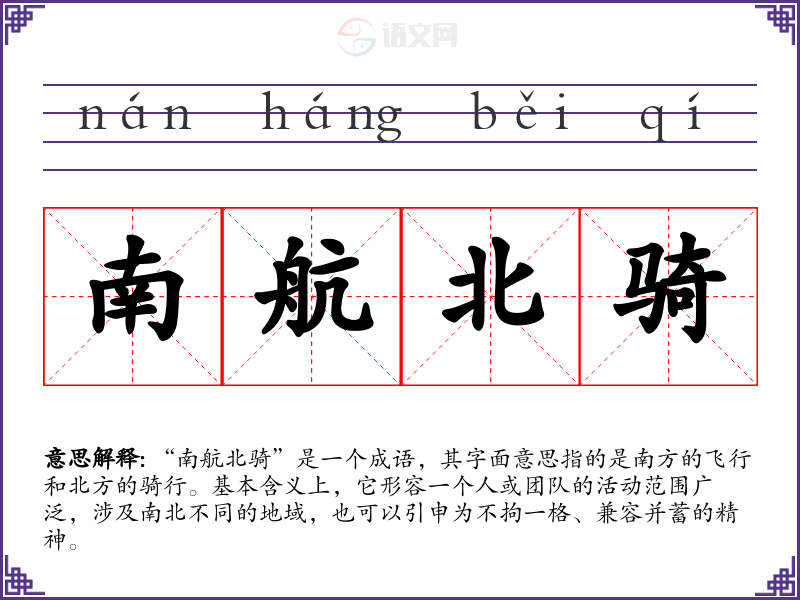 “南航北骑”是一个成语,其字面意思指的是南方的飞行和北方的骑行。基本含义上,它形容一个人或团队的活动范围广泛,涉及南北不同的地域,也可以引申为不拘一格、兼容并蓄的精神。