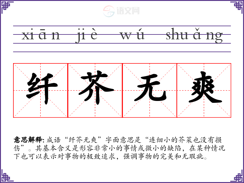 该成语常用于文学作品、演讲、职场沟通等场景中。例如,在文学作品中,作者可以用“纤芥无爽”来描绘人物的完美追求;在职场中,领导可能用此成语来激励团队注重细节和质量。