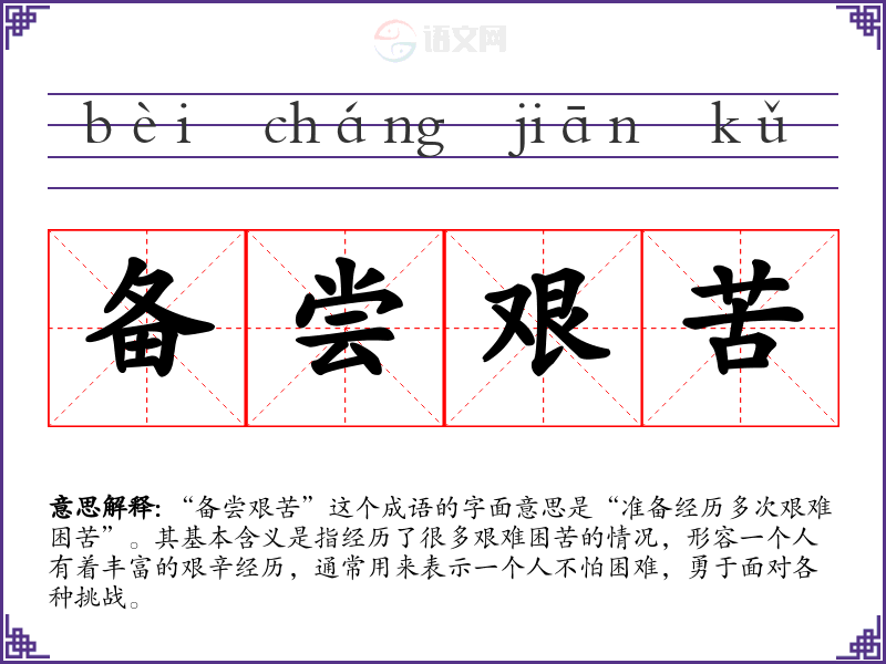 “备尝艰苦”这个成语的字面意思是“准备经历多次艰难困苦”。其基本含义是指经历了很多艰难困苦的情况,形容一个人有着丰富的艰辛经历,通常用来表示一个人不怕困难,勇于面对各种挑战。