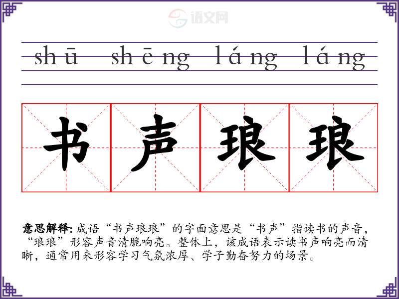 - 鸦雀无声:形容非常安静,和“书声琅琅”的喧闹形成鲜明对比。
