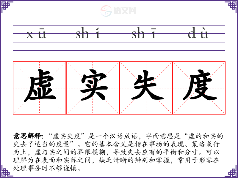 “虚实失度”是一个汉语成语,字面意思是“虚的和实的失去了适当的度量”。它的基本含义是指在事物的表现、策略或行为上,虚与实之间的界限模糊,导致失去应有的平衡和分寸。可以理解为在表面和实际之间,缺乏清晰的辨别和掌握,常用于形容在处理事务时不够谨慎。