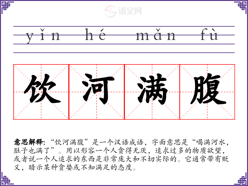 “饮河满腹”是一个汉语成语,字面意思是“喝满河水,肚子也满了”。用以形容一个人贪得无厌,追求过多的物质欲望,或者说一个人追求的东西是非常庞大和不切实际的。它通常带有贬义,暗示某种贪婪或不知满足的态度。