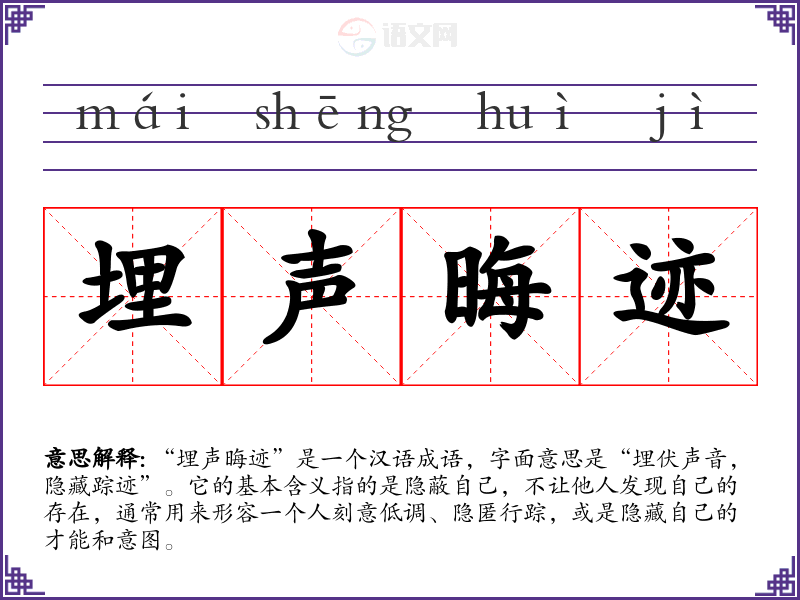 该成语的出处并不明确,但它由“埋声”和“晦迹”两个部分组成。“埋声”意指隐藏声音,“晦迹”意指遮掩踪迹。成语的用法可以追溯到古代汉语文献中,隐喻那些不愿高调表现自己或在某种情况下选择低调行事的人。