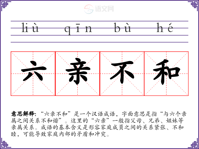 “六亲不和”是一个汉语成语,字面意思是指“与六个亲属之间关系不和谐”。这里的“六亲”一般指父母、兄弟、姐妹等亲属关系。成语的基本含义是形容家庭成员之间的关系紧张、不和睦,可能导致家庭内部的矛盾和冲突。