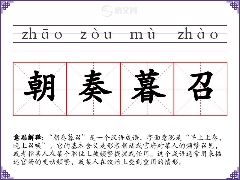 “朝奏暮召”出自《后汉书·王允传》,原文是“朝奏暮召,故常侍于前。”意思是早上向**上奏,晚上又被召见,形容王允在朝中受到的重用与宠信。这一成语反映了古代官场中频繁的升迁和变化,以及当时政治环境的不稳定性。