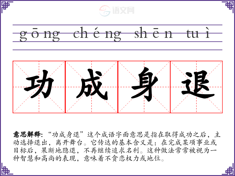 “功成身退”这个成语字面意思是指在取得成功之后,主动选择退出,离开舞台。它传达的基本含义是:在完成某项事业或目标后,果断地隐退,不再继续追求名利。这种做法常常被视为一种智慧和高尚的表现,意味着不贪恋权力或地位。