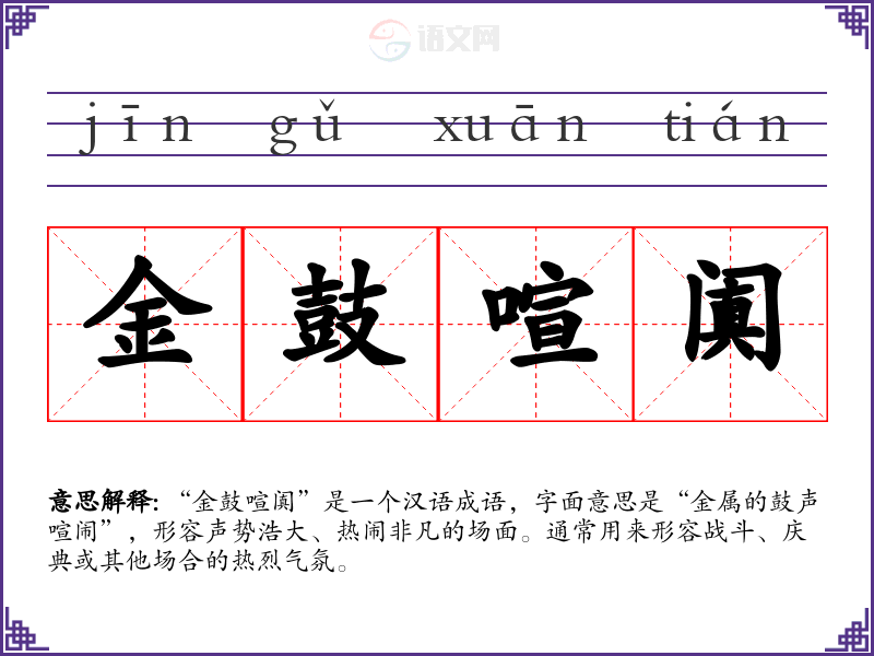 “金鼓喧阗”是一个汉语成语,字面意思是“金属的鼓声喧闹”,形容声势浩大、热闹非凡的场面。通常用来形容战斗、庆典或其他场合的热烈气氛。