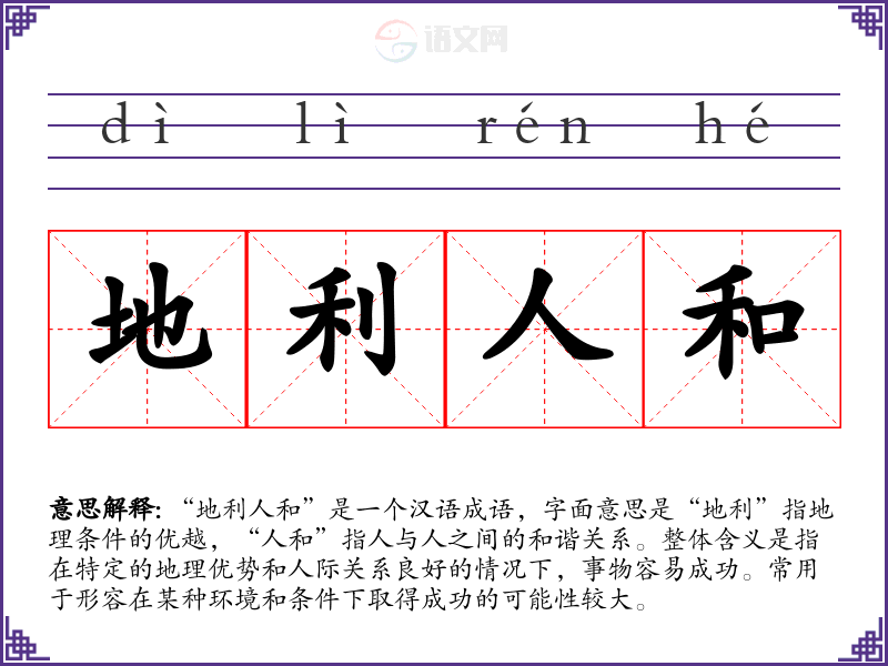 “地利人和”是一个汉语成语,字面意思是“地利”指地理条件的优越,“人和”指人与人之间的和谐关系。整体含义是指在特定的地理优势和人际关系良好的情况下,事物容易成功。常用于形容在某种环境和条件下取得成功的可能性较大。