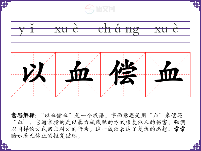 “以血偿血”是一个成语,字面意思是用“血”来偿还“血”。它通常指的是以暴力或残酷的方式报复他人的伤害,强调以同样的方式回击对方的行为。这一成语表达了复仇的思想,常常暗示着无休止的报复循环。
