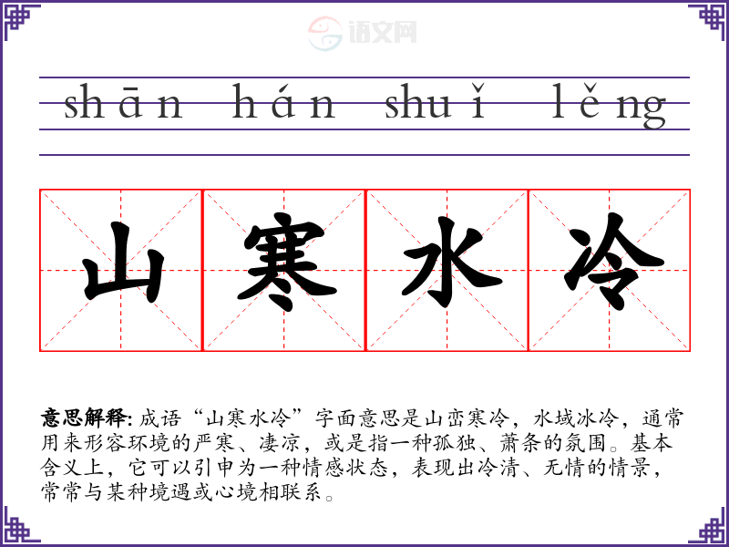 - 同义成语:如“冷冷清清”,指环境或气氛的冷清、荒凉,与“山寒水冷”相似。