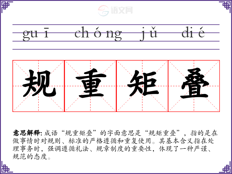 成语“规重矩叠”的字面意思是“规矩重叠”,指的是在做事情时对规则、标准的严格遵循和重复使用。其基本含义指在处理事务时,强调遵循礼法、规章制度的重要性,体现了一种严谨、规范的态度。