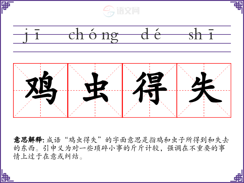成语“鸡虫得失”的字面意思是指鸡和虫子所得到和失去的东西。引申义为对一些琐碎小事的斤斤计较,强调在不重要的事情上过于在意或纠结。