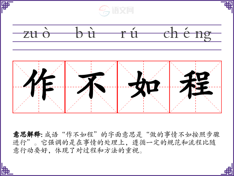 成语“作不如程”的字面意思是“做的事情不如按照步骤进行”。它强调的是在事情的处理上,遵循一定的规范和流程比随意行动要好,体现了对过程和方法的重视。