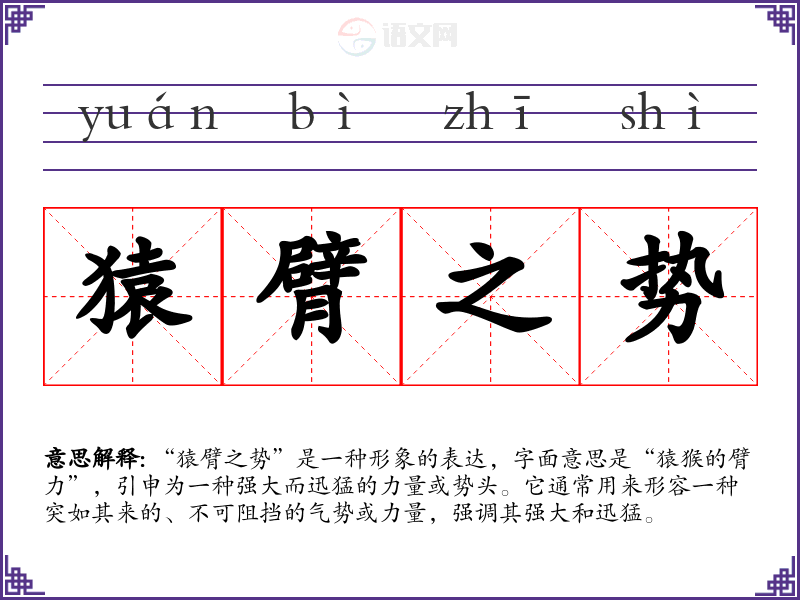 “猿臂之势”是一种形象的表达,字面意思是“猿猴的臂力”,引申为一种强大而迅猛的力量或势头。它通常用来形容一种突如其来的、不可阻挡的气势或力量,强调其强大和迅猛。