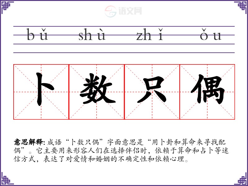 成语“卜数只偶”字面意思是“用卜卦和算命来寻找配偶”。它主要用来形容人们在选择伴侣时,依赖于算命和占卜等迷信方式,表达了对爱情和婚姻的不确定性和依赖心理。