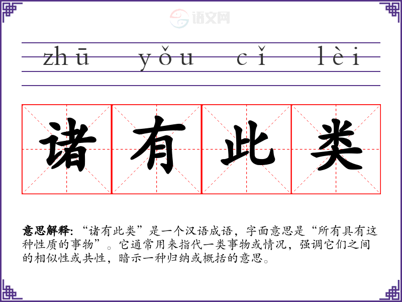 “诸有此类”是一个汉语成语,字面意思是“所有具有这种性质的事物”。它通常用来指代一类事物或情况,强调它们之间的相似性或共性,暗示一种归纳或概括的意思。
