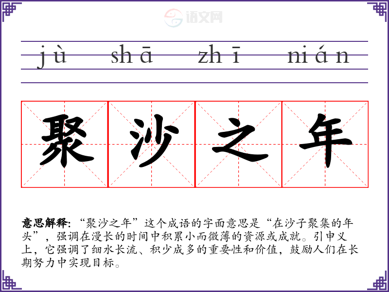 通过对“聚沙之年”的学,我更加理解了在生活和学中,耐心和坚持的重要性。这一成语不仅丰富了我的语言表达,也为我面对挑战时提供了心理支持。在今后的学*和生活中,我将继续秉持这种“聚沙之年”的精神,努力实现自己的目标。