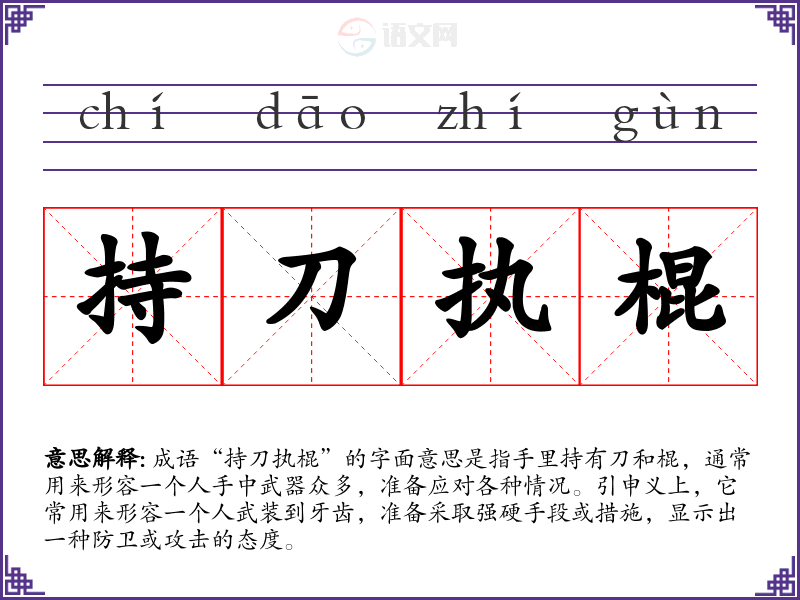 成语“持刀执棍”的字面意思是指手里持有刀和棍,通常用来形容一个人手中武器众多,准备应对各种情况。引申义上,它常用来形容一个人武装到牙齿,准备采取强硬手段或措施,显示出一种防卫或攻击的态度。