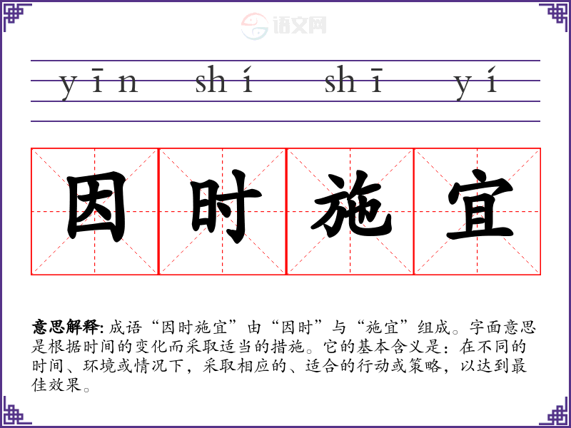 成语“因时施宜”由“因时”与“施宜”组成。字面意思是根据时间的变化而采取适当的措施。它的基本含义是:在不同的时间、环境或情况下,采取相应的、适合的行动或策略,以达到最佳效果。