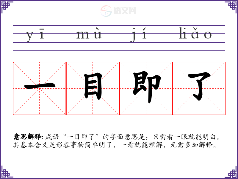 “一目即了”并没有特定的历史典故或文学出处,但其字面构成和含义在古代文献中常有体现,反映了古人对事物直观、简洁理解的追求。它的构成“目”指眼睛,看,“即”表示很快,“了”是明白的意思,组合在一起强调了事物的直观性和明了性。