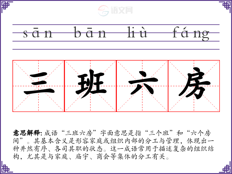 成语“三班六房”字面意思是指“三个班”和“六个房间”。其基本含义是形容家庭或组织内部的分工与管理,体现出一种井然有序、各司其职的状态。这一成语常用于描述复杂的组织结构,尤其是与家庭、庙宇、商会等集体的分工有关。