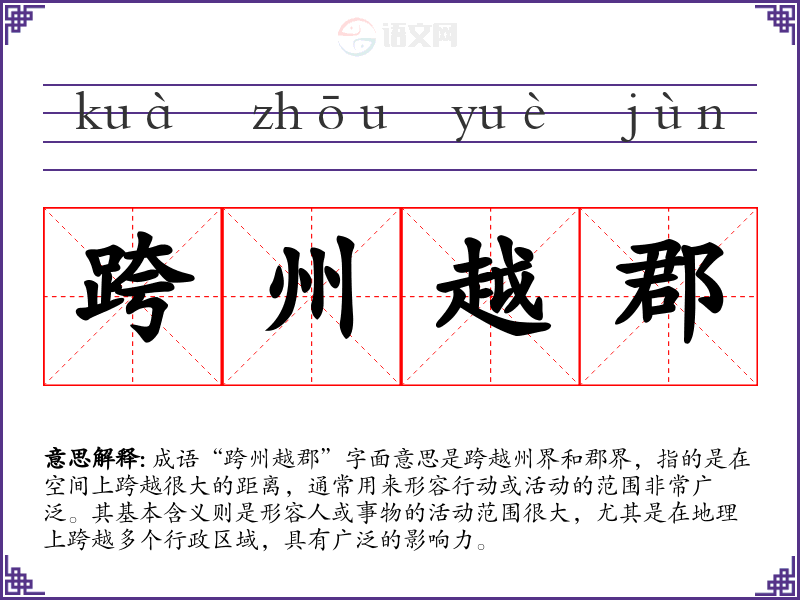 成语“跨州越郡”字面意思是跨越州界和郡界,指的是在空间上跨越很大的距离,通常用来形容行动或活动的范围非常广泛。其基本含义则是形容人或事物的活动范围很大,尤其是在地理上跨越多个行政区域,具有广泛的影响力。