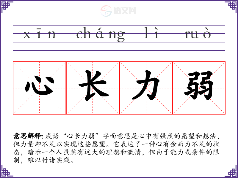 成语“心长力弱”字面意思是心中有强烈的愿望和想法,但力量却不足以实现这些愿望。它表达了一种心有余而力不足的状态,暗示一个人虽然有远大的理想和激情,但由于能力或条件的限制,难以付诸实践。