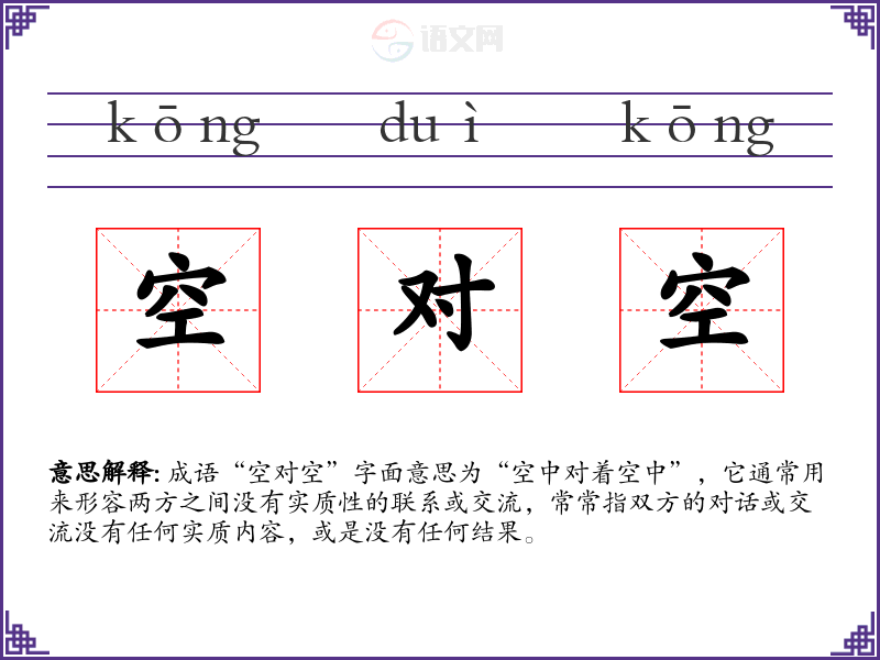 成语“空对空”字面意思为“空中对着空中”,它通常用来形容两方之间没有实质性的联系或交流,常常指双方的对话或交流没有任何实质内容,或是没有任何结果。