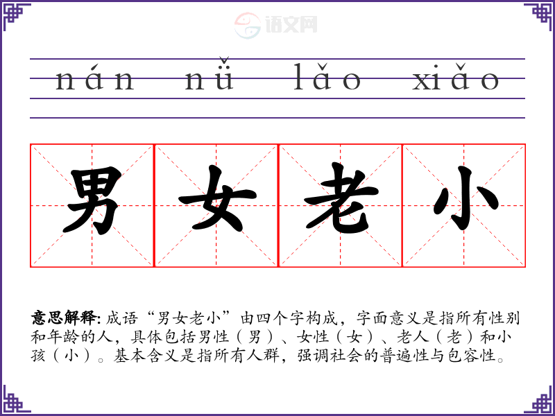 成语“男女老小”由四个字构成,字面意义是指所有性别和年龄的人,具体包括男性(男)、女性(女)、老人(老)和小孩(小)。基本含义是指所有人群,强调社会的普遍性与包容性。