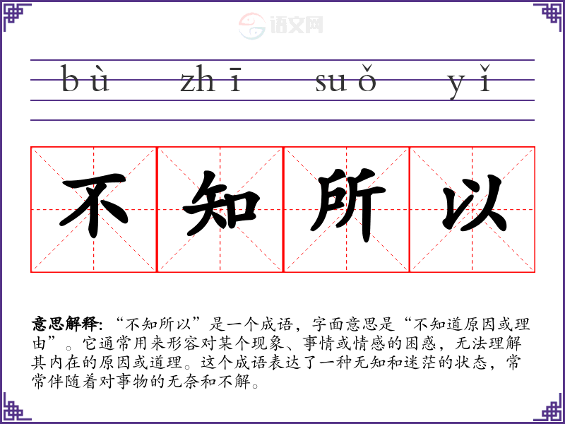 “不知所以”是一个成语,字面意思是“不知道原因或理由”。它通常用来形容对某个现象、事情或情感的困惑,无法理解其内在的原因或道理。这个成语表达了一种无知和迷茫的状态,常常伴随着对事物的无奈和不解。