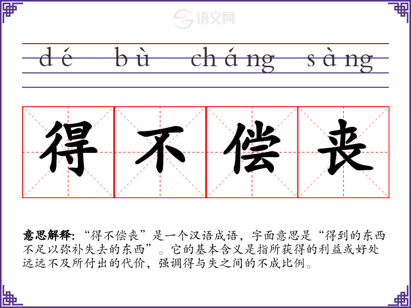 “得不偿丧”是一个汉语成语,字面意思是“得到的东西不足以弥补失去的东西”。它的基本含义是指所获得的利益或好处远远不及所付出的代价,强调得与失之间的不成比例。