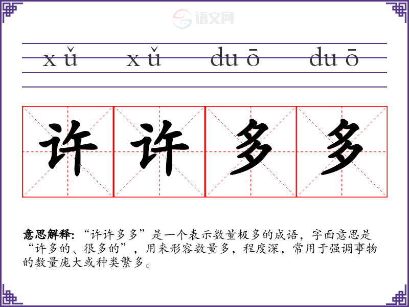 “许许多多”是一个表示数量极多的成语,字面意思是“许多的、很多的”,用来形容数量多,程度深,常用于强调事物的数量庞大或种类繁多。