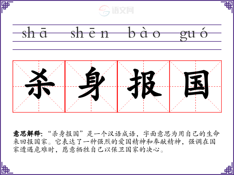 “杀身报国”是一个汉语成语,字面意思为用自己的生命来回报国家。它表达了一种强烈的爱国精神和奉献精神,强调在国家遭遇危难时,愿意牺牲自己以保卫国家的决心。