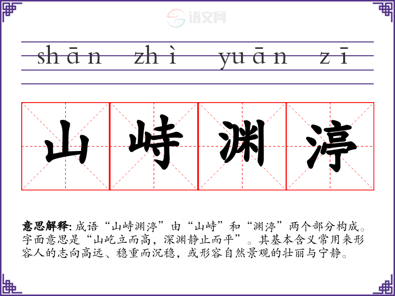 成语“山峙渊渟”由“山峙”和“渊渟”两个部分构成。字面意思是“山屹立而高,深渊静止而平”。其基本含义常用来形容人的志向高远、稳重而沉稳,或形容自然景观的壮丽与宁静。