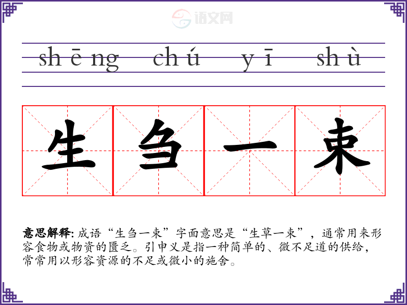 成语“生刍一束”字面意思是“生草一束”,通常用来形容食物或物资的匮乏。引申义是指一种简单的、微不足道的供给,常常用以形容资源的不足或微小的施舍。