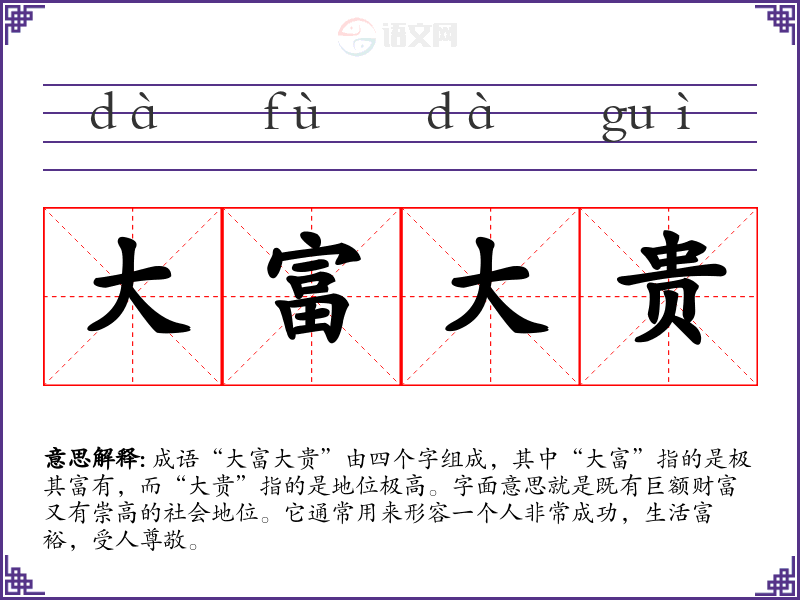 成语“大富大贵”由四个字组成,其中“大富”指的是极其富有,而“大贵”指的是地位极高。字面意思就是既有巨额财富又有崇高的社会地位。它通常用来形容一个人非常成功,生活富裕,受人尊敬。