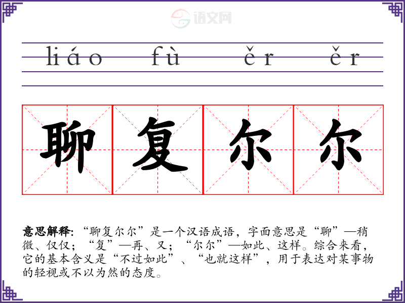 “聊复尔尔”是一个汉语成语,字面意思是“聊”—稍微、仅仅;“复”—再、又;“尔尔”—如此、这样。综合来看,它的基本含义是“不过如此”、“也就这样”,用于表达对某事物的轻视或不以为然的态度。