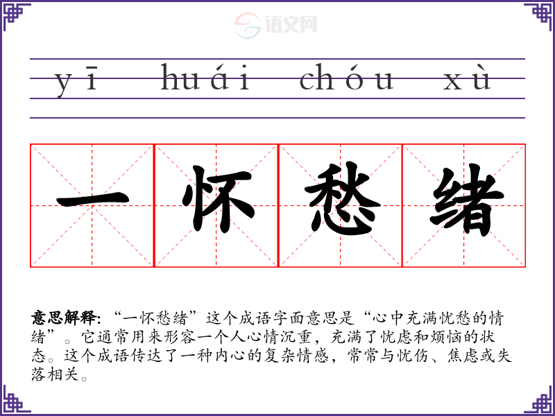 “一怀愁绪”这个成语字面意思是“心中充满忧愁的情绪”。它通常用来形容一个人心情沉重,充满了忧虑和烦恼的状态。这个成语传达了一种内心的复杂情感,常常与忧伤、焦虑或失落相关。