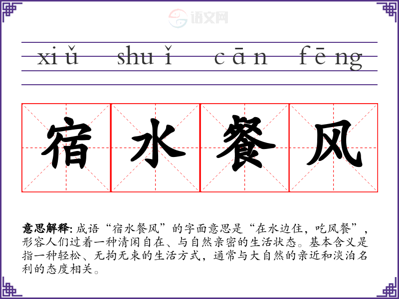 成语“宿水餐风”的字面意思是“在水边住,吃风餐”,形容人们过着一种清闲自在、与自然亲密的生活状态。基本含义是指一种轻松、无拘无束的生活方式,通常与大自然的亲近和淡泊名利的态度相关。