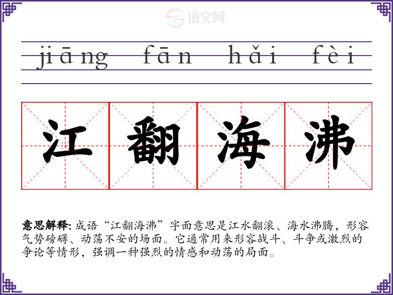 成语“江翻海沸”字面意思是江水翻滚、海水沸腾,形容气势磅礴、动荡不安的场面。它通常用来形容战斗、斗争或激烈的争论等情形,强调一种强烈的情感和动荡的局面。