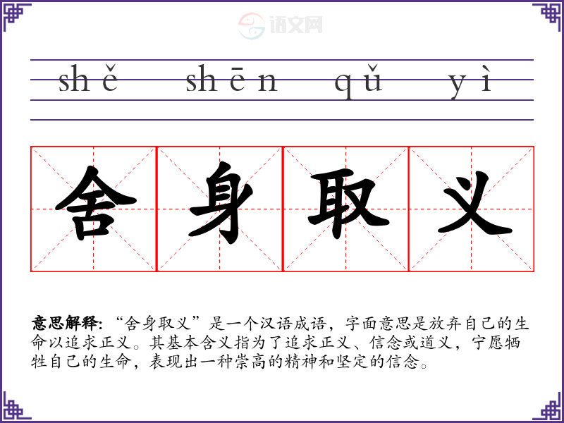 “舍身取义”是一个汉语成语,字面意思是放弃自己的生命以追求正义。其基本含义指为了追求正义、信念或道义,宁愿牺牲自己的生命,表现出一种崇高的精神和坚定的信念。