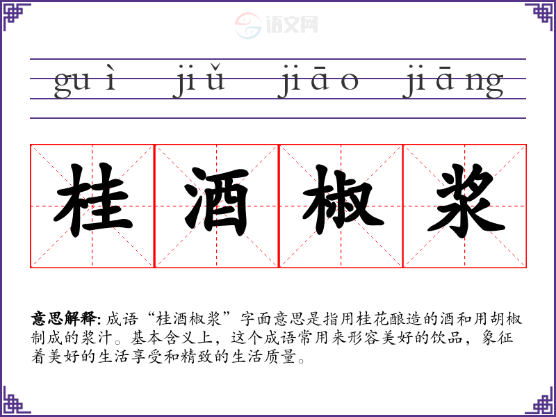 成语“桂酒椒浆”字面意思是指用桂花酿造的酒和用胡椒制成的浆汁。基本含义上,这个成语常用来形容美好的饮品,象征着美好的生活享受和精致的生活质量。