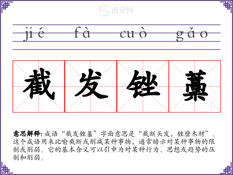 成语“截发锉藳”字面意思是“截断头发,锉磨木材”。这个成语用来比喻截断或削减某种事物,通常暗示对某种事物的限制或削弱。它的基本含义可以引申为对某种行为、思想或趋势的压制和削弱。