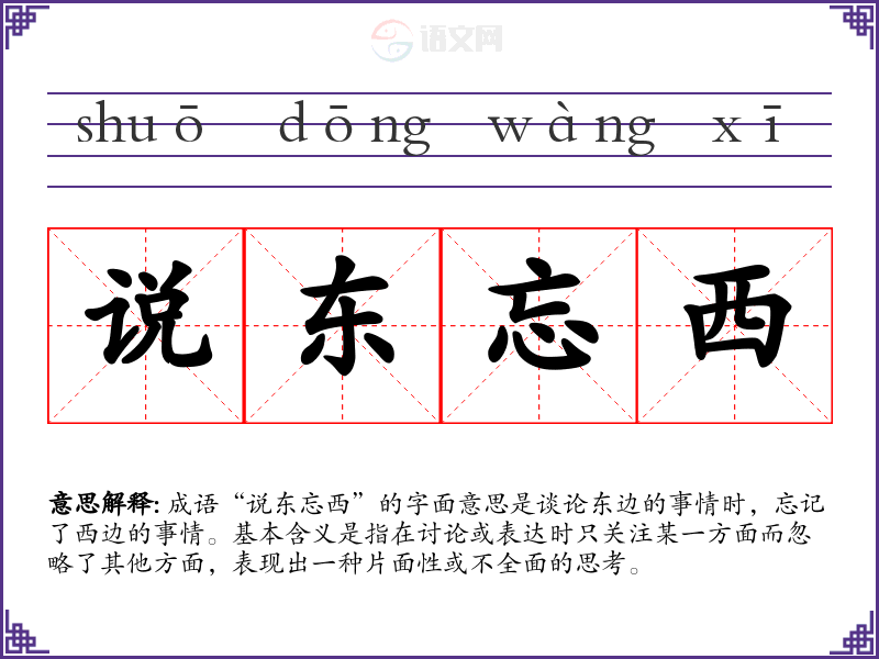 成语“说东忘西”的字面意思是谈论东边的事情时,忘记了西边的事情。基本含义是指在讨论或表达时只关注某一方面而忽略了其他方面,表现出一种片面性或不全面的思考。