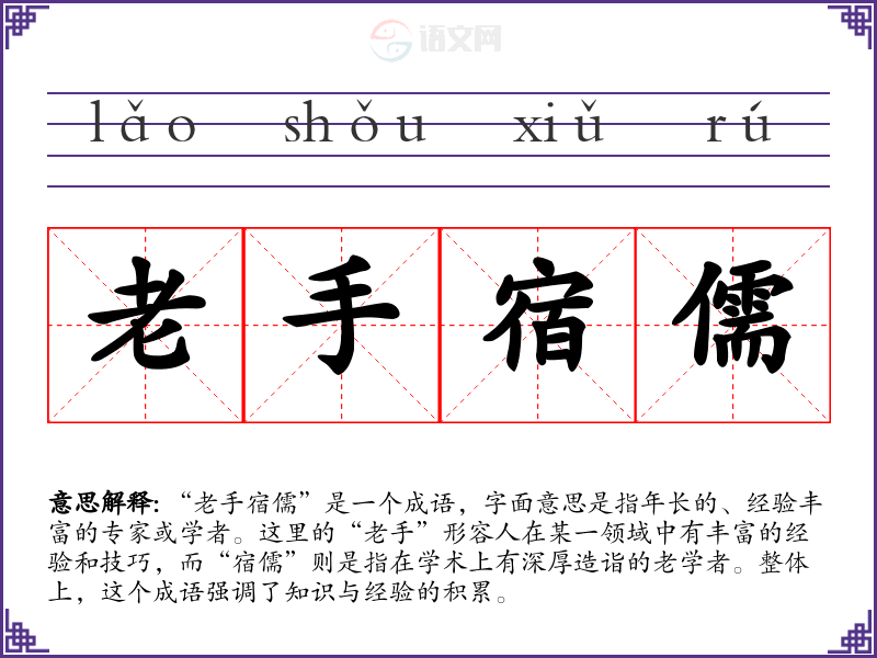 “老手宿儒”是一个成语,字面意思是指年长的、经验丰富的专家或学者。这里的“老手”形容人在某一领域中有丰富的经验和技巧,而“宿儒”则是指在学术上有深厚造诣的老学者。整体上,这个成语强调了知识与经验的积累。