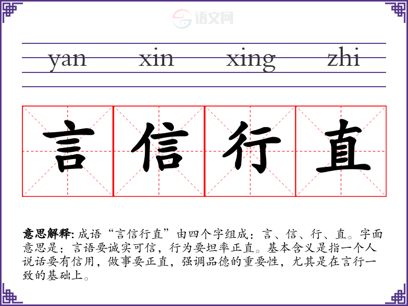 成语“言信行直”由四个字组成:言、信、行、直。字面意思是:言语要诚实可信,行为要坦率正直。基本含义是指一个人说话要有信用,做事要正直,强调品德的重要性,尤其是在言行一致的基础上。