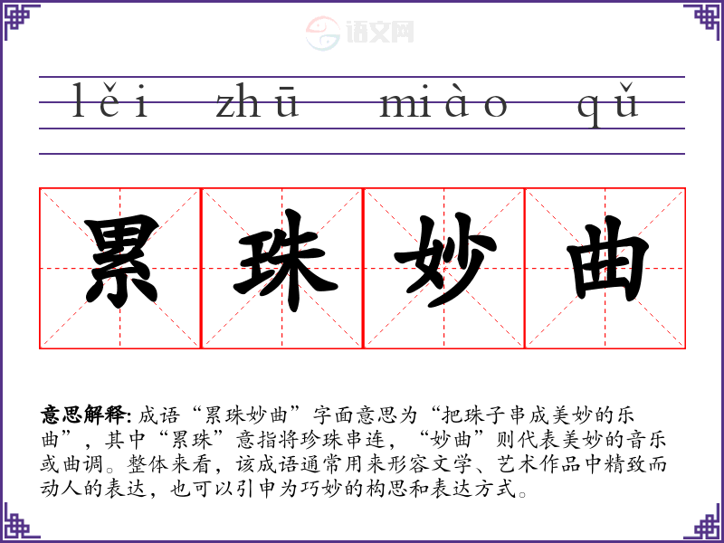 通过对“累珠妙曲”的学,我认识到细腻表达的重要性。在语言学和表达中,注重细节和艺术感能提升交流的深度与美感。这一成语不仅丰富了我的词汇,也增强了我对语言艺术的理解与欣赏。